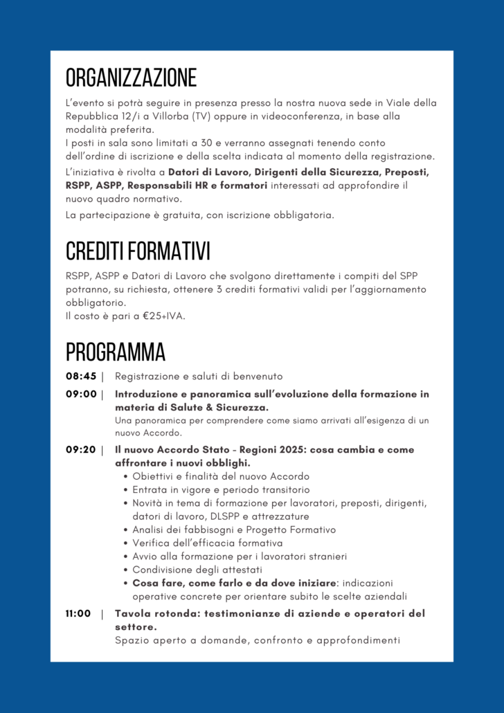 Attivi dal 2005 siamo una società di servizi e consulenza che mira a supportare le aziende nella realizzazione di soluzioni per la gestione dei temi della Salute e Sicurezza sul Lavoro, dell’Ambiente e della Formazione, mantenendole allineate alla normativa vigente.